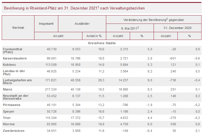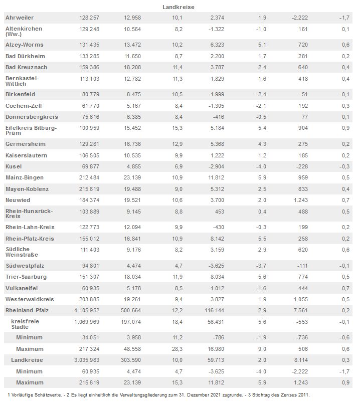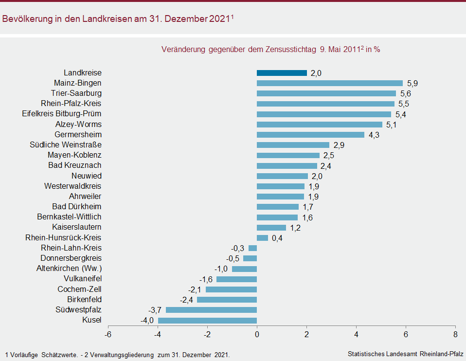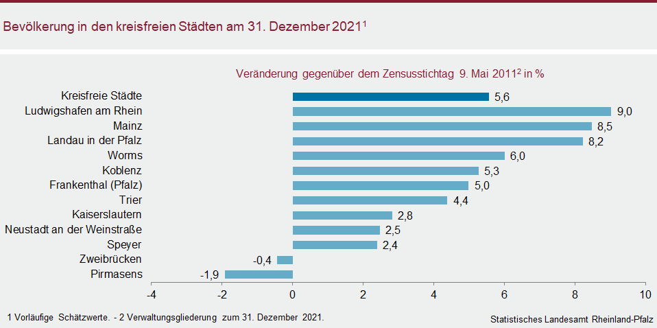 Die Bevölkerung wuchs in den Städten Ludwigshafen und Mainz gegenüber dem Zensusstichtag 2011 am stärksten (plus 9,0 bzw. plus 8,5 Prozent). In den kreisfreien Städten Zweibrücken und Pirmasens verringerte sie sich geringfügig (minus 0,4 bzw. minus 1,9 Prozent). 16 der 24 Landkreise verzeichneten leichte Zugewinne, acht mussten Einwohnerverluste hinnehmen. In den Landkreisen Mainz-Bingen, Trier-Saarburg sowie im Rhein-Pfalz-Kreis, Eifelkreis Bitburg-Prüm und Kreis Alzey-Worms nahm die Einwohnerzahl im Vergleich der Landkreise mit jeweils mehr als fünf Prozent am stärksten zu. Die Kreise Kusel und Südwestpfalz verzeichneten gegenüber 2011 die deutlichsten Rückgänge (minus 4,0 bzw. minus 3,7 Prozent).