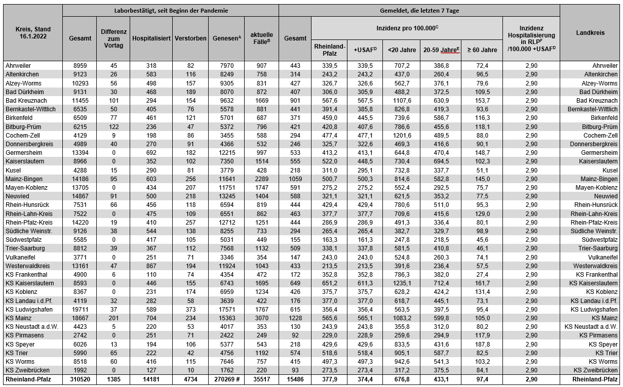 Coronavirus SARS-CoV-2: Fallzahlen für Rheinland-Pfalz, (Datenstand vom 16.01.2022, 11:10 Uhr)
