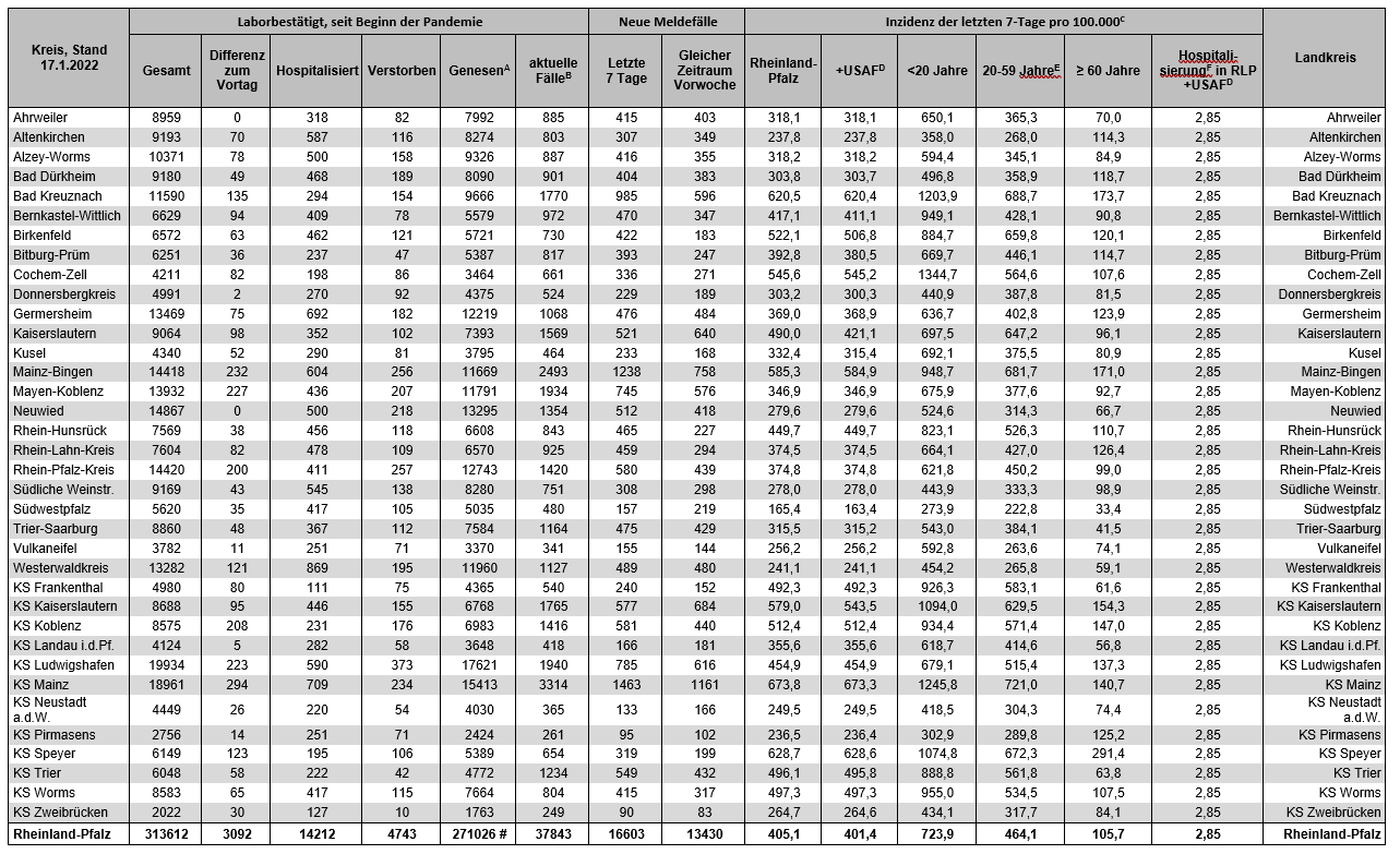 Coronavirus SARS-CoV-2: Fallzahlen für Rheinland-Pfalz, (Datenstand vom 17.01.2022, 14:10 Uhr)