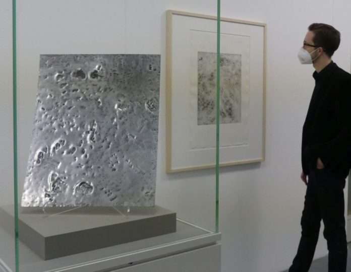Die Vorstellung, dass eine zierliche Frau mit einem dreieinhalb Tonnen schweren Gabelstapler über Metallplatten fährt und diese so zerbeulten und zerkratzten Oberflächen als Druckstöcke nutzt, ist ungewohnt. Und doch ist es die Technik, mit der Marie Gouil zurzeit gerne ihre Grafiken herstellt. Die Künstlerin wurde nun mit dem ersten Lions Club Lutra Art Award im Hof des Museums Pfalzgalerie Kaiserslautern (mpk) ausgezeichnet. Fünf Arbeiten von 2021 hat das Museum des Bezirksverbands Pfalz bekommen: einen Holzschnitt, eine Radierung und einen Hochdruck, jeweils auf Büttenpapier und ohne Titel, sowie einen Druckstock aus bearbeiteter Hartfaserplatte und eine mit dem Gabelstapler bearbeitete Zinkplatte. „Das mpk ist Nutznießer dieser sehr begrüßenswerten Initiative des Lions Club Lutra Kaiserslautern und kann dadurch seinen Bestand erweitern“, sagte Museumsdirektorin Dr. Britta E. Buhlmann bei der Preisverleihung. Sie dankte sowohl dem Lions Club Lutra, der vier Arbeiten für das mpk erworben habe, als auch der Künstlerin, die einen Druckstock dazugeschenkt habe. Gerade die beiden Druckstöcke seien für die pädagogische Vermittlung sehr wertvoll, könne man damit doch die künstlerische Technik besser erläutern.