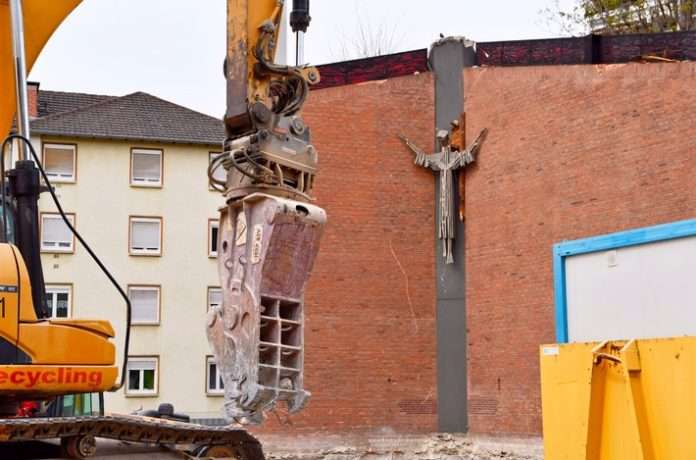 Bildunterschrift: SWR Fernsehen BETRIFFT, „Gott ohne Haus? – Wenn die Kirchen verschwinden“, am Mittwoch (26.01.22) um 20:15 Uhr. Bagger gegen Jesus: Die Heilig-Kreuz-Kirche in Ludwigshafen hat ausgedient. © SWR