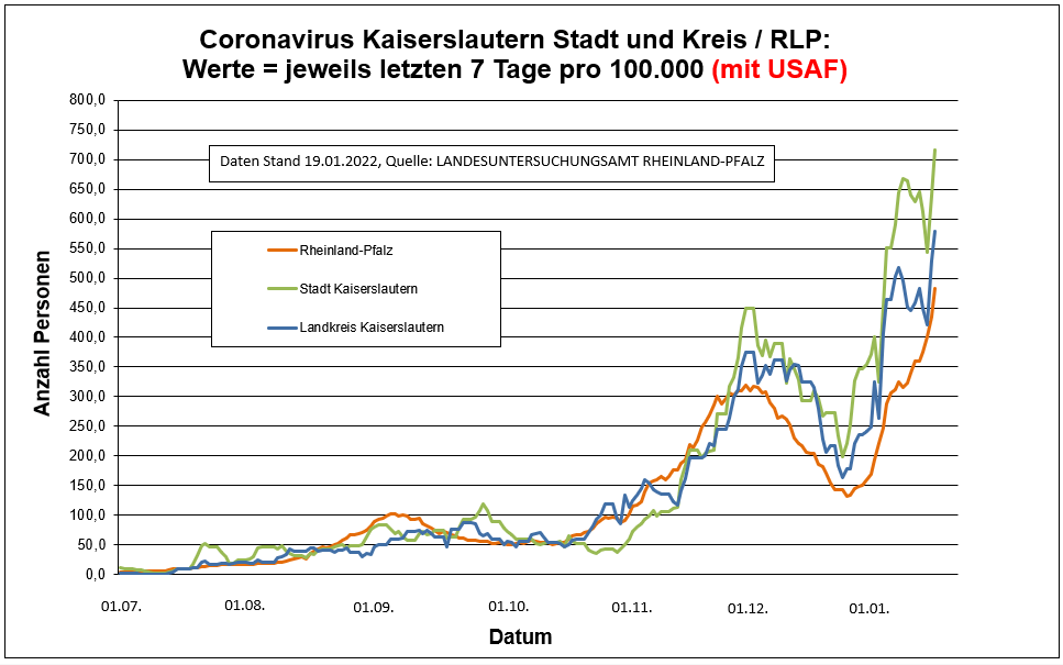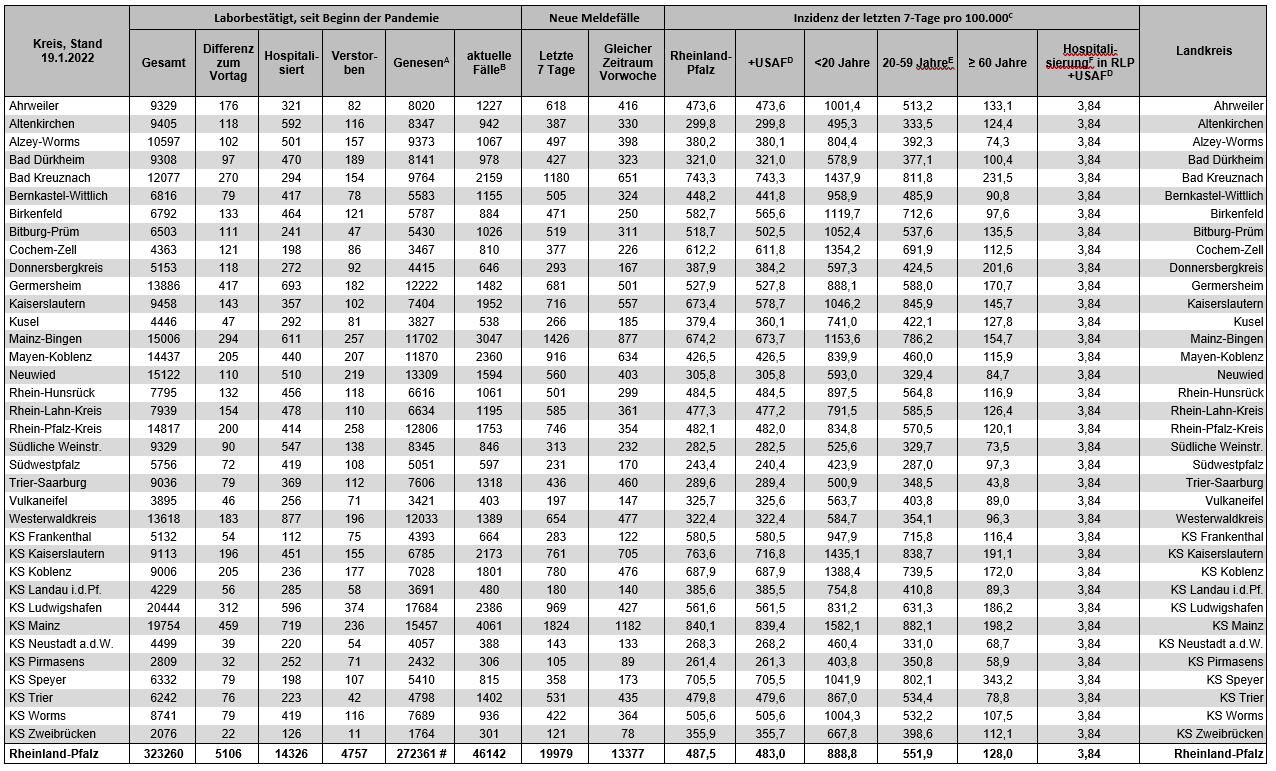 Coronavirus SARS-CoV-2: Fallzahlen für Rheinland-Pfalz, (Datenstand vom 19.01.2022, 14:10 Uhr)