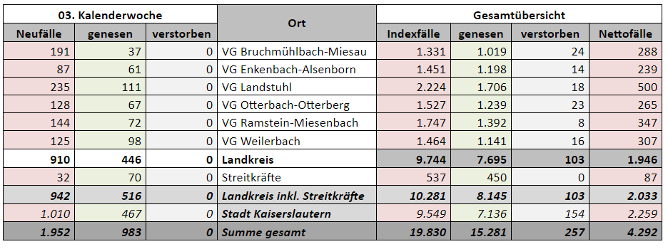 KL – Coronavirus Stadt/Kreis: 19.830 Indexfälle in Stadt und Landkreis, 15.281 genesenen Personen, 257 Todesfälle, KW 3.