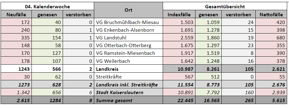 KL – Coronavirus Stadt/Kreis: 22.445 Indexfälle in Stadt und Landkreis, 16.565 genesenen Personen, 265 Todesfälle, KW 4.