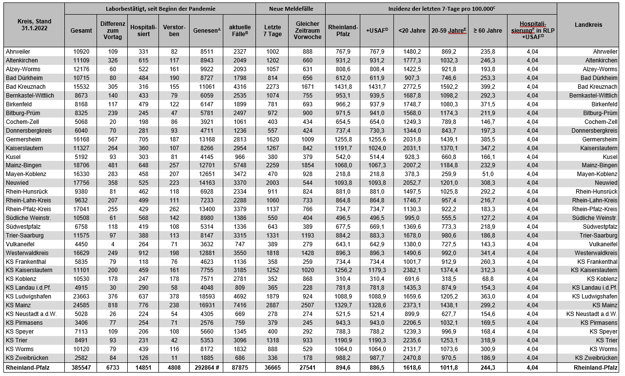 Coronavirus SARS-CoV-2: Fallzahlen für Rheinland-Pfalz, (Datenstand vom 31.01.2022, 14:10 Uhr)