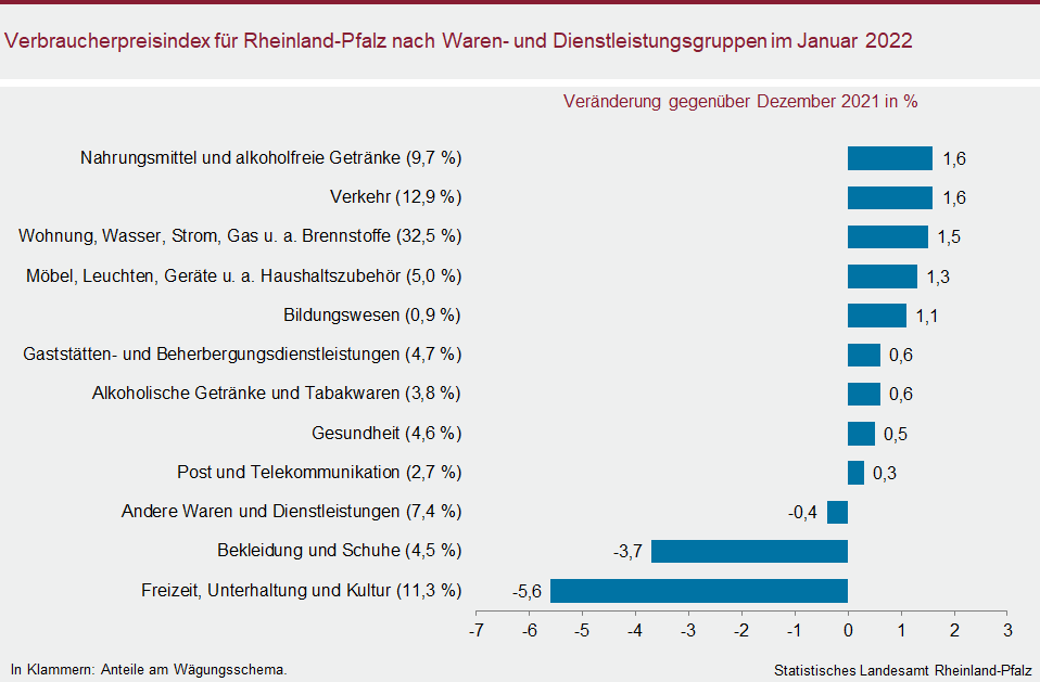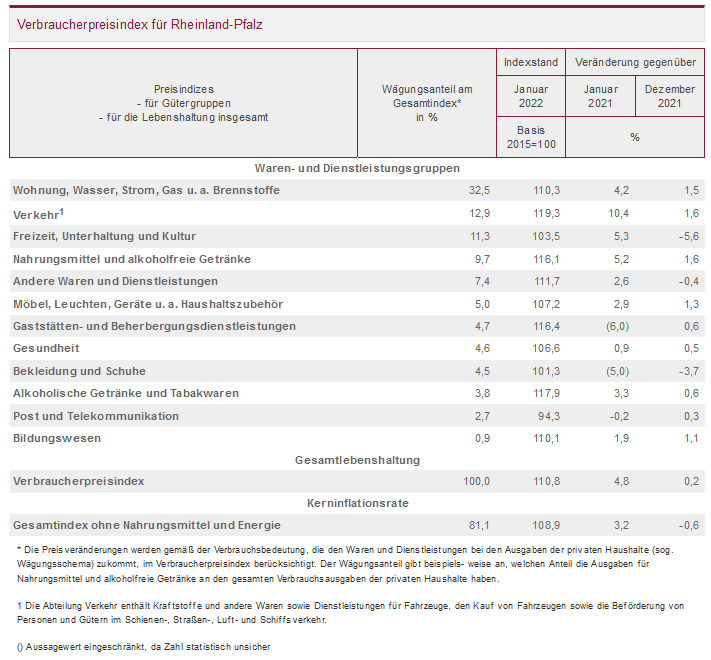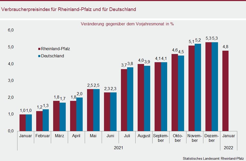 Die Preissteigerung in Rheinland-Pfalz schwächt sich zum Jahresauftakt ab. Wie das Statistische Landesamt in Bad Ems mitteilt, lag der Verbraucherpreisindex für Rheinland-Pfalz im Januar 2022 um 4,8 Prozent über dem Niveau des Vorjahresmonats. Im Dezember 2021 betrug die Inflationsrate plus 5,3 Prozent.