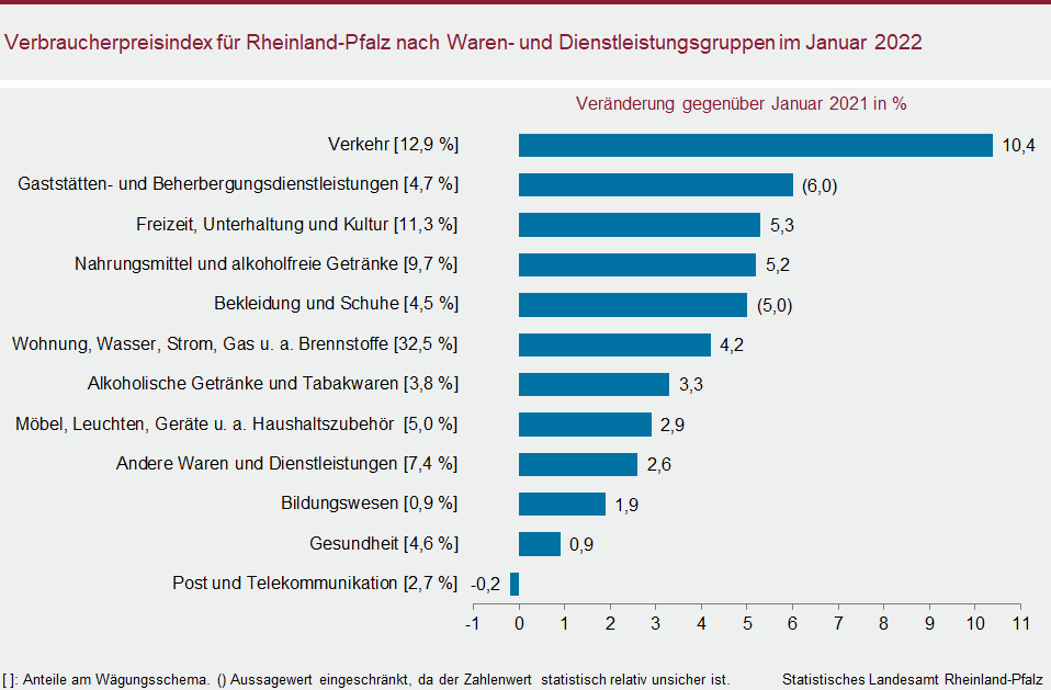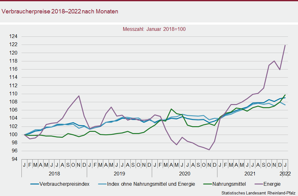Ursächlich für die weiterhin hohe Teuerungsrate dürften nach wie vor die Preiserhöhungen auf den vorgelagerten Wirtschaftsstufen durch steigende Großhandels- und Erzeugerpreise sein. Auch die Erhöhung der CO2-Steuer im Januar 2022 wirkt neben anderen Preiseffekten preistreibend.