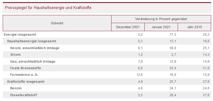 Die Energiepreise waren im Januar 2022 wesentlich höher als im Vorjahresmonat (plus 17,3 Prozent). Der Grund dafür sind starke Preissteigerungen bei Mineralölprodukten (plus 30,4 Prozent): Sowohl die Preise für Heizöl (einschließlich Umlage) als auch die Kraftstoffpreise zogen spürbar an (plus 39 bzw. plus 25,7 Prozent). Für Fernwärme und für Gas (einschließlich Umlage) mussten die Konsumentinnen und Konsumenten ebenfalls deutlich mehr bezahlen als im Januar 2021 (plus 16 bzw. plus 12,9 Prozent). Steigende Preise gab es außerdem – trotz der Senkung der EEG-Umlage – bei Strom (plus 2,7 Prozent).