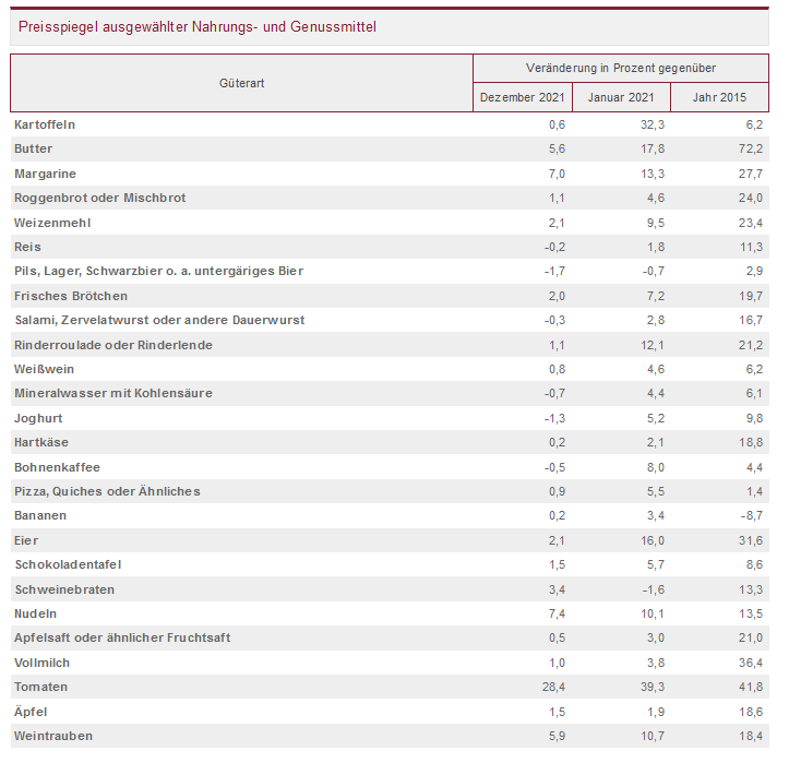 Binnen Jahresfrist legten die Nahrungsmittelpreise um 5,2 Prozent zu. Besonders kräftig fielen die Preiszuwächse bei Speisefetten und Speiseölen sowie beim Gemüse aus (plus 15,4 bzw. plus 12,1 Prozent). So kostete Butter 17,8 Prozent mehr als vor einem Jahr. Beim Gemüse stiegen die Preise für Tomaten und Kartoffeln besonders deutlich (plus 39,3 bzw. plus 32,3 Prozent). Die geringsten Preissteigerungen gab es im Bereich „Zucker, Marmelade, Honig und andere Süßwaren“ (plus 2,1 Prozent; darunter Schokoladentafeln plus 5,7 Prozent).