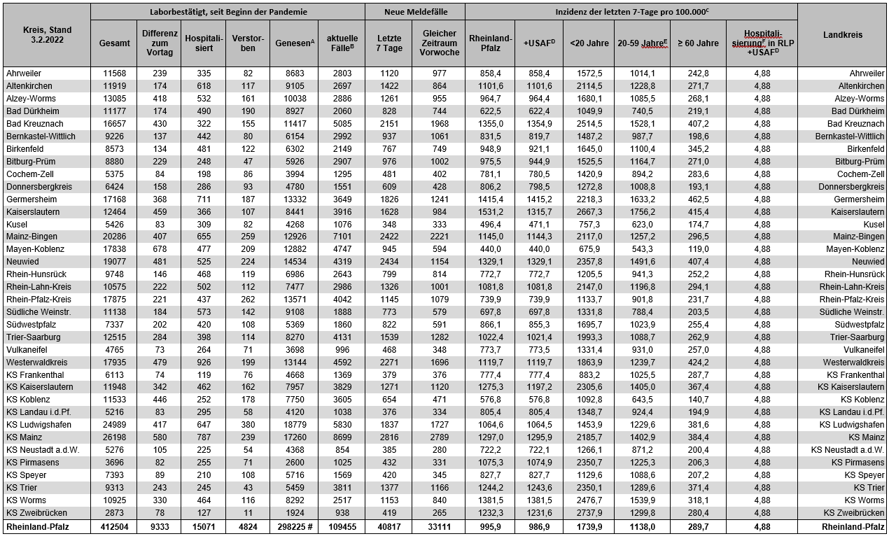 Coronavirus SARS-CoV-2: Fallzahlen für Rheinland-Pfalz, (Datenstand vom 03.02.2022, 14:10 Uhr)