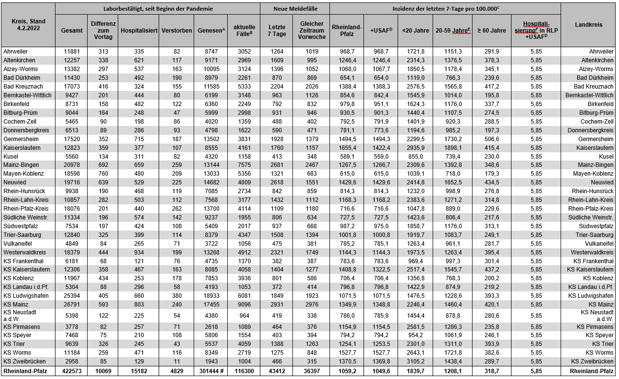 Coronavirus SARS-CoV-2: Fallzahlen für Rheinland-Pfalz, (Datenstand vom 04.02.2022, 14:10 Uhr)