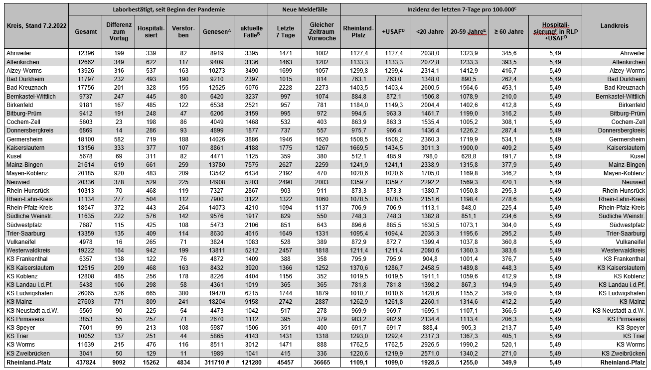 Coronavirus SARS-CoV-2: Fallzahlen für Rheinland-Pfalz, (Datenstand vom 07.02.2022, 14:10 Uhr)