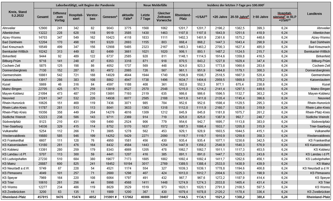 Coronavirus SARS-CoV-2: Fallzahlen für Rheinland-Pfalz, (Datenstand vom 09.02.2022, 14:10 Uhr)