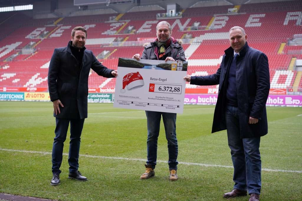 Fans des 1. FC Kaiserslautern ermöglichen im Rahmen der Krombacher Zipfelmützenaktion eine Spende über 6.372,88 Euro an die Betze-Engel. Es freuen sich (v.l.n.r.): Tobias Frey (stellv. Vorstandsvorsitzender 1. FC Kaiserslautern), Horst Schömbs (Botschafter der Betze-Engel) und Oliver Johannes (Verkaufsleiter Gastronomie Krombacher Brauerei).