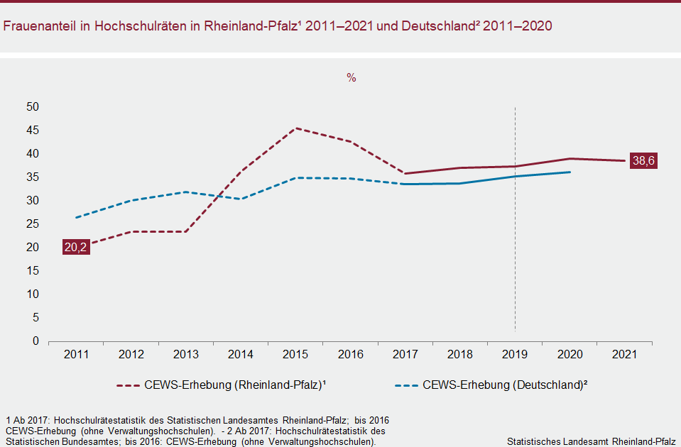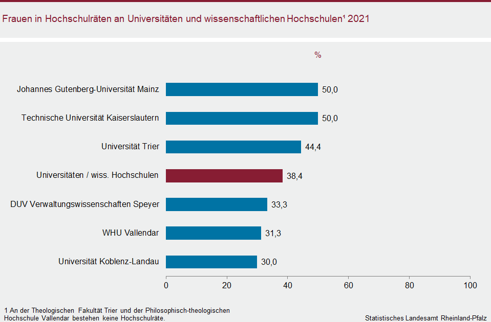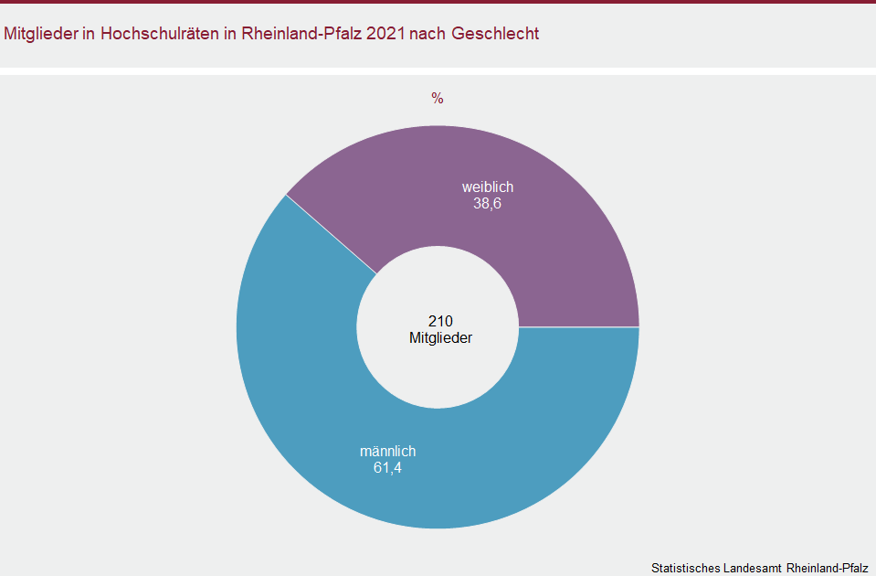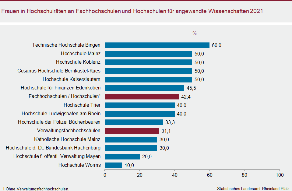 An den rheinland-pfälzischen Hochschulen waren im Jahr 2021 insgesamt 81 Frauen Mitglied in einem Hochschulrat. Wie das Statistische Landesamt in Bad Ems mitteilt, lag damit der Frauenanteil in den Hochschulräten bei 39 Prozent. Im Jahr 2011 waren es nach Angaben des Kompetenzzentrums Frauen in Wissenschaft und Forschung (CEWS) rund 20 Prozent. Hochschulräte übernehmen in der Regel hochschulstrategische und beratende Aufgaben. Mit einem jeweiligen Geschlechteranteil von 50 Prozent hatten die Universitäten in Kaiserslautern und Mainz sowie die Hochschulen Mainz, Kaiserslautern, Koblenz und Bernkastel-Kues ein besonders ausgeglichenes Geschlechterverhältnis im Hochschulrat. Ausschließlich an der Technischen Hochschule Bingen (60 Prozent) stellten die Frauen die Mehrheit innerhalb der Hochschulräte. An Fachhochschulen und Hochschulen für angewandte Wissenschaften lag der Frauenanteil in den Hochschulräten bzw. Kuratorien mit 42 Prozent am höchsten und an Verwaltungshochschulen mit 31 Prozent am niedrigsten. An den Universitäten und wissenschaftlichen Hochschulen waren 38 Prozent der Plätze in den Hochschulräten mit einer Frau besetzt.