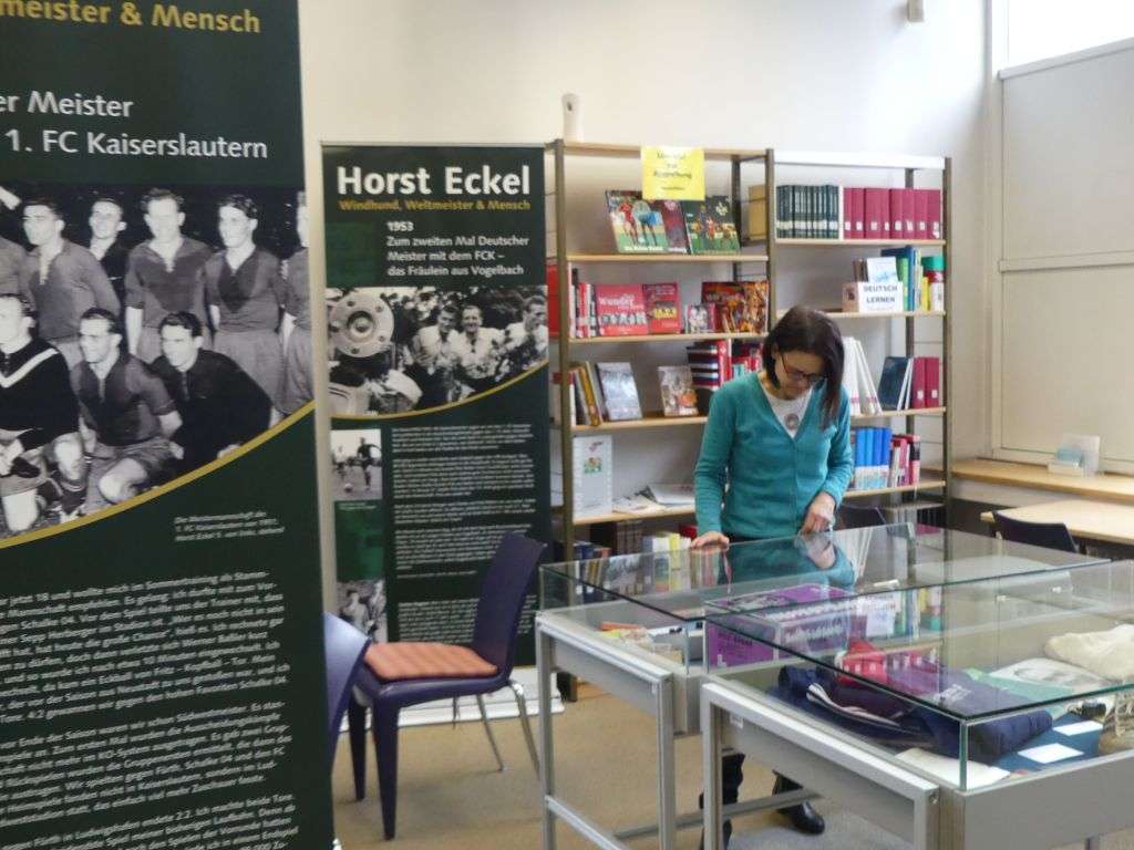 Anlässlich Horst Eckels 90. Geburtstag zeigt die Pfalzbibliothek in Kaiserslautern eine Ausstellung mit dem Titel „Windhund, Mensch und Weltmeister“ bis 8. April. „Die Ausstellung ist Teil einer größeren Präsentation, die bereits im Pfälzischen Sportmuseum Hauenstein zu sehen war“, sagte Pfalzbibliotheksleiterin Claudia Germann bei der Eröffnung ohne Publikum, die live über das Internet verfolgt werden konnte und weiterhin unter www.pfalzbibliothek.de abrufbar ist. „Die Leihgaben stammen von der Familie Eckel“, nur die Schuhe, die Eckel beim WM-Spiel 1954 trug, seien von Adidas für die Ausstellung ausgeliehen und von einem Boten am Eröffnungstag gebracht worden.