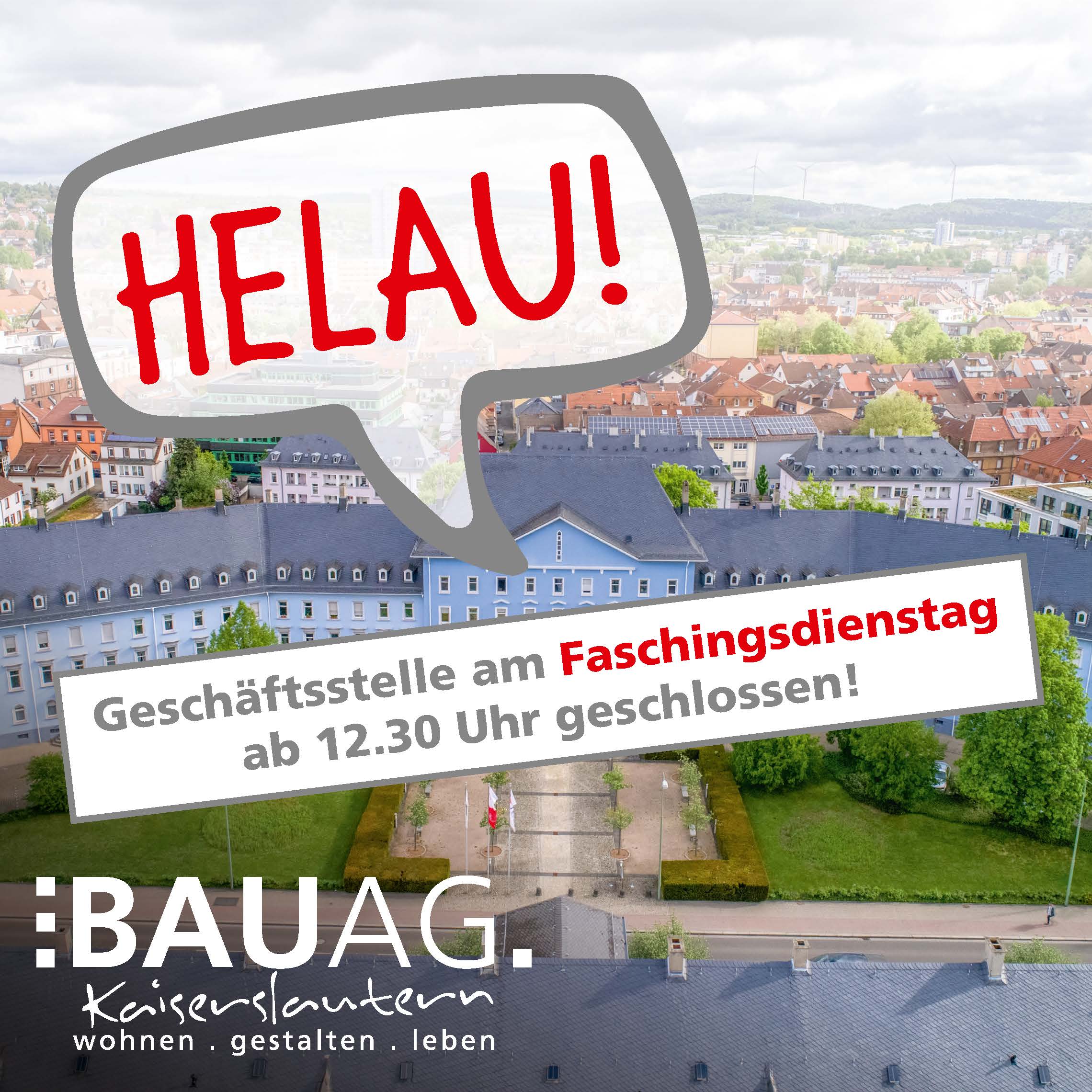 Die Geschäftsstelle der Bau AG in der Fischerstraße 25 ist am Faschingsdienstag, 1. März 2022, ab 12.30 Uhr geschlossen. Ab Mittwoch, 2. März 2022, ist die Geschäftsstelle wieder zu den gewohnten Zeiten geöffnet.