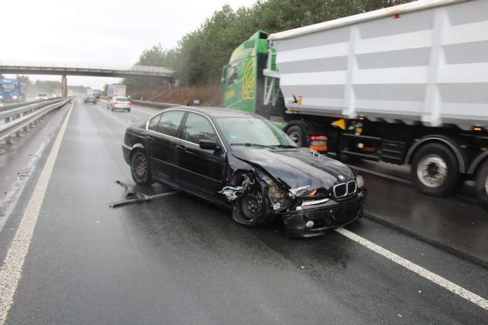 Am gestrigen Donnerstag, gegen 15:20 Uhr, geriet der BMW eines 22-jähringen Fahrzeugführers aufgrund nicht angepasster Geschwindigkeit bei regennasser Fahrbahn auf dem linken Fahrstreifen kurz vor dem Autobahndreieck Kaiserslautern ins Schleudern. Der Fahrzeuglenker kann den Pkw nicht mehr steuern und kollidiert mit einem auf dem rechten Fahrstreifen fahrenden Sattelzug. Durch den Anstoß schleudert der BMW nach rechts, prallt gegen den Bordstein, dreht sich um 180 Grad und bleibt mit erheblichen Schäden stehen. Der Fahrer blieb glücklicherweise unverletzt. Der Verkehr wurde durch die Beamten der Autobahnpolizei auf dem Standstreifen an der Unfallstelle vorbeigeleitet. Es entstand Sachschaden von mehreren tausend Euro.