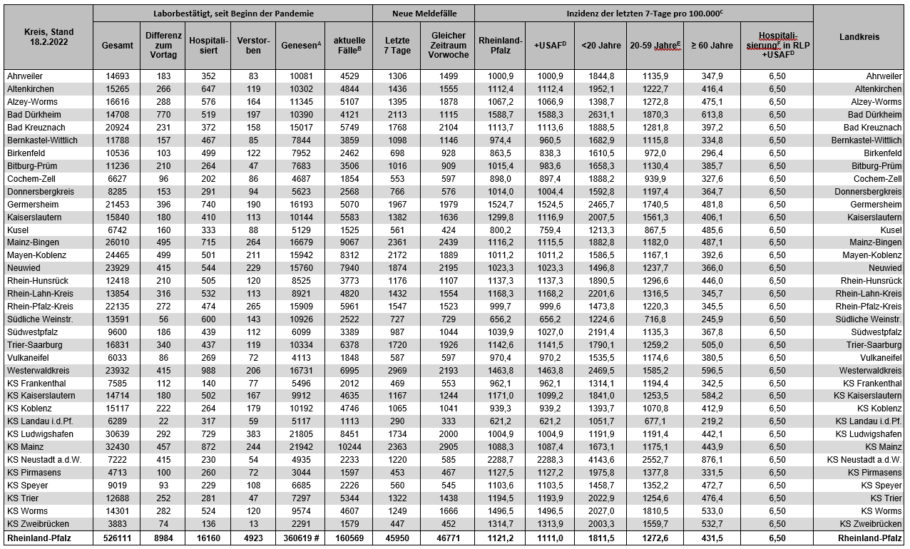 Coronavirus SARS-CoV-2: Fallzahlen für Rheinland-Pfalz, (Datenstand vom 18.02.2022, 14:10 Uhr)