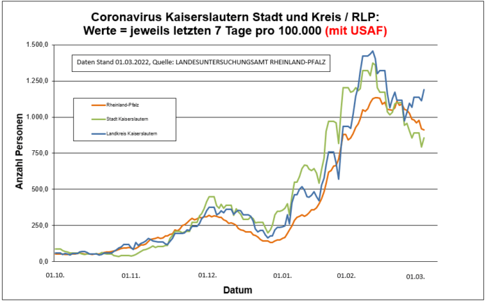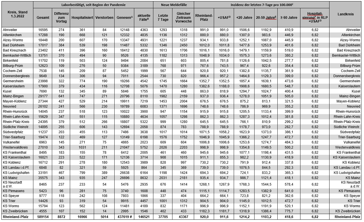Coronavirus SARS-CoV-2: Fallzahlen für Rheinland-Pfalz, (Datenstand vom 01.03.2022, 14:10 Uhr)