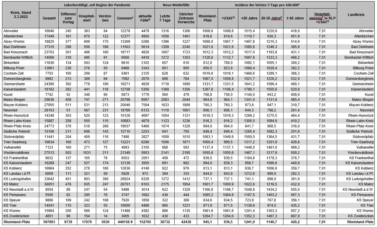 Coronavirus SARS-CoV-2: Fallzahlen für Rheinland-Pfalz, (Datenstand vom 02.03.2022, 14:10 Uhr)