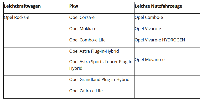 Schon heute können Opel-Kunden auf ein umfangreiches Angebot an elektrifizierten Modellen zugreifen. Alle leichten Nutzfahrzeuge sind bereits emissionsfrei unterwegs: Opel Combo-e, Vivaro-e und Movano-e batterie-elektrisch; optional gibt’s es den Vivaro-e HYDROGEN mit Wasserstoff-Brennstoffzelle. Bei den Pkw sind Opel Corsa-e und Mokka‑e – die Gewinner des Goldenen Lenkrads 2020 und 20211 – längst Bestseller. Der E-Anteil an verkauften Neuwagen in diesen beiden Baureihen liegt bei über 25 Prozent. Der neue Opel Grandland genauso wie die neue Astra-Generation sind als Plug-in-Hybride zu haben. Im nächsten Jahr kommt der batterie-elektrische Opel Astra-e hinzu – als Fünftürer wie als Sports Tourer. Abgerundet wird das Angebot an emissionsfreien E‑Fahrzeugen vom Opel Rocks-e, dem City-Stromer für Jugendliche ab 15 Jahre2.