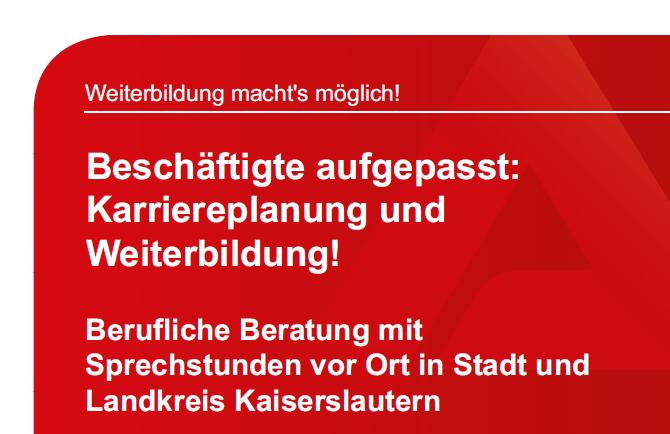 Die Agentur für Arbeit Kaiserslautern-Pirmasens bietet mit ihrer beruflichen Beratung ab sofort regelmäßige Sprechstunden für Beschäftigte vor Ort in der Stadt und im Landkreis Kaiserslautern an.