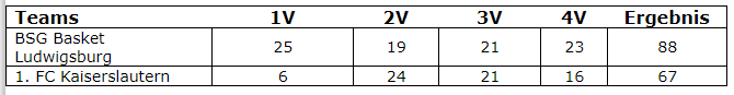 Zu reserviert in der Defensive und aus Angst zu früh in Foultrouble zu kommen, starteten die FCK’ler sehr schwach ins 1. Viertel. (6:25) Deutlich wacher und aggressiver spielten die Lautrer dafür im 2. und 3. Viertel und verkürzten kurzzeitig einen 24 Punkte Rückstand auf nur 6 Punkte, sie kämpften toll und spielten sehr gut als Team zusammen. Leider ließen die Kräfte der 6 Spieler im letzten Durchgang nach, wobei das gegnerische Team mit einem ausgeglichenen Kader von 12 Mann ständig wechseln konnte. Die Ludwigburger drehten noch einmal richtig auf und trafen sehr sicher von der 3- Punkte Linie, wodurch das Team um Mario Coursey dann mit 67:88 verlor. Alles in allem haben die roten Teufel großartig gekämpft und können trotz der Niederlage hocherhobenen Hauptes nach Hause fahren.