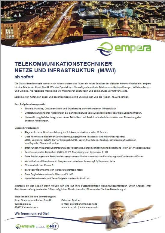Interesse an der Stelle? Dann freuen wir uns auf Ihre aussagekräftigen Bewerbungsunterlagen unter Angabe Ihrer Gehaltsvorstellung sowie des frühestmöglichen Eintrittstermins. Bitte senden Sie Ihre Bewerbung an: K-net Telekommunikation GmbH Europaallee 10 67657 Kaiserslautern Oder per Mail an: E-Mail: bewerbung@empera.de Wir freuen uns auf Sie!
