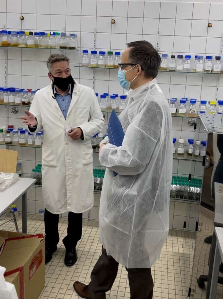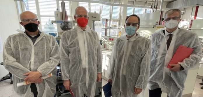 Laborbesuch in Pirmasens: – Anlässlich der Kick-off Veranstaltung Waste2Value stand auch ein Rundgang durch die Labore der Hochschule Kaiserslautern auf dem Programm: Vizepräsident Forschung Prof. Dr. med. Karl-Herbert Schäfer, Prof. Dr. Georg Krausch, Präsident der Johannes Gutenberg-Universität Mainz und Landeskoordinator für die Biotechnologie, Staatssekretär Dr. Denis Alt, Präsident Prof. Dr.-Ing. Hans-Joachim Schmidt (v.l.n.r. _ Foto: HSKL)