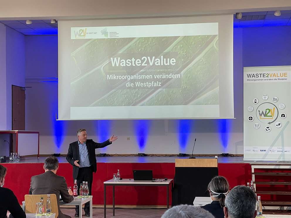 „Die Arbeit von Waste2Value stößt wichtige Prozesse an, um dem Klimawandel entschieden entgegenzutreten und neue Impulse für eine ressourcenschonende Produktion zu setzen. Die Kooperation zwischen Wissenschaft und den Unternehmen in der Westpfalz ist ein Meilenstein für den rheinland-pfälzischen Biotechnologiestand-ort und macht unser Leben nachhaltiger“, sagte der Staatssekretär im Ministerium für Wissenschaft und Gesundheit, Dr. Denis Alt im Rahmen einer Kick- Off Veranstaltung am 10. März für die Umsetzungsphase von „Waste2Value“ konnten sich interessierte Unternehmen und Institutionen über konkrete Beteiligungsmöglichkeiten informieren. Im Rahmen von Innovationsprojekten können sie in den kommenden drei bis sechs Jahren Zugang zu den für das W2V-Bündnis vorgesehenen BMBF-Fördermitteln erhalten. Auch Dr. Gisela Philipsenburg, Leiterin des Referats „Nachhaltige regionale Innovationsinitiativen“ im Bundesministerium für Bildung und Forschung, und Prof. Dr. Georg Krausch, Präsident der Johannes Gutenberg-Universität Mainz und Landeskoordinator für die Biotechnologie ergriffen das Wort und wiesen auf die vielversprechenden Perspektiven des Innovationsbündnisses hin.