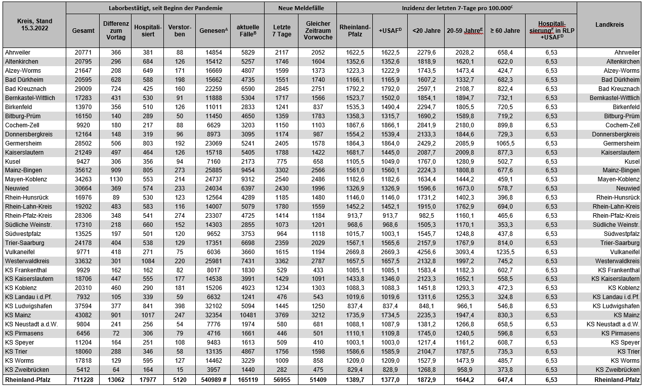 Coronavirus SARS-CoV-2: Fallzahlen für Rheinland-Pfalz, (Datenstand vom 15.03.2022, 14:10 Uhr)