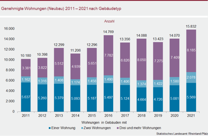 Im Jahr 2021 wurden in Rheinland-Pfalz erheblich mehr Genehmigungen zur Errichtung von neuen Wohngebäuden erteilt als im Jahr zuvor. Nach Angaben des Statistischen Landesamtes in Bad Ems stieg die Zahl um gut 13 Prozent auf 7.532. Die Anzahl der Wohnungen, die in diesen Gebäuden entstehen sollen, lag mit 15.832 (plus 12,5 Prozent gegenüber 2020) auf dem höchsten Wert seit 2003 (15.864).