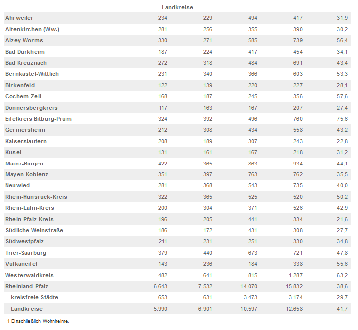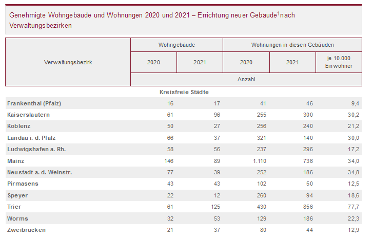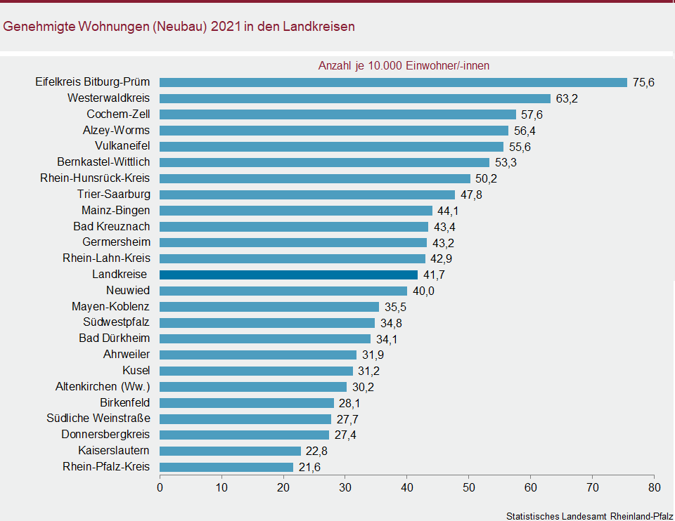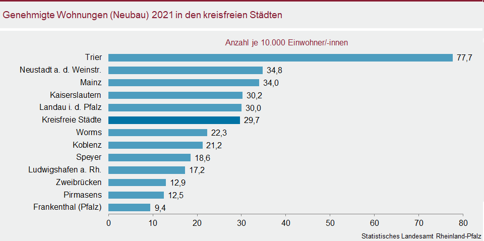 Landesweit kamen auf 10.000 Einwohnerinnen bzw. Einwohner rechnerisch rund 39 Wohnungen in genehmigten neuen Wohngebäuden, wobei ein deutlicher Niveauunterschied zwischen den kreisfreien Städten (30 Wohnungen) und den Landkreisen (42 Wohnungen) besteht. Unter den kreisfreien Städten wies Trier mit fast 78 Wohnungen den mit Abstand höchsten Wert auf. Die niedrigsten Werte gab es in Frankenthal (Pfalz) mit 9,4 sowie in Pirmasens und Zweibrücken mit 12,5 bzw. 12,9 Wohnungen je 10.000 Einwohnerinnen bzw. Einwohner. Unter den Landkreisen lagen der Eifelkreis Bitburg-Prüm mit 76 und der Westerwaldkreis mit 63 Wohnungen an der Spitze. Die niedrigsten Werte unter den Landkreisen verzeichneten der Rhein-Pfalz-Kreis mit 22 und der Kreis Kaiserslautern mit 23 neuen Wohnungen je 10.000 Einwohnerinnen bzw. Einwohner