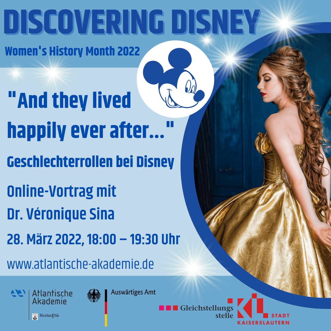 Adlig, attraktiv, abhängig: Disneyprinzessinnen und andere Frauenfiguren des Zeichentrickimperiums zeichnen sich, genau wie ihre männlichen Counterparts, traditionell durch konventionelle und veraltete Geschlechterrollen aus. In den letzten Jahren scheint die Walt Disney Company allerdings mit dem bewährten Klischee zu brechen und produziert Animationsfilme, die starke und unabhängige Frauen zeigen. In einem Onlinevortrag erklärt Dr. Véronique Sina, ob es Disney wirklich schafft, mit alten Rollenbildern aufzuräumen, und ob der Erfolg von Disneyfilmen von den klassischen Frauen- und Männerrollen lebt. Der Vortrag, welcher in Kooperation mit der Gleichstellungsbeauftragten der Stadt Kaiserslautern, Katharina Disch, der Atlantischen Akademie und mit Unterstützung des Auswärtigen Amts veranstaltet wird, findet am 28. März 2022 um 18:00 Uhr via ClickMeeting statt. Anmeldungen erfolgen unter www.atlantische-akademie.de/disneygender. Die Zugangsdaten werden nach der Anmeldung versendet.