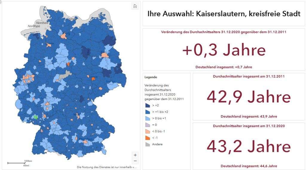 Die interaktive Anwendung bietet Informationen zum Durchschnittsalter der Bevölkerung in allen Kreisen und kreisfreien Städten Deutschlands insgesamt sowie getrennt nach Frauen und Männern. Das Durchschnittsalter stieg im Landkreis Wittmund (Niedersachsen) mit 2,2 Jahren (2011: 44,3 Jahre; 2020: 46,5 Jahre) deutschlandweit am stärksten an. Leipzig (Sachsen) verzeichnete die deutlichste Verjüngung (minus 1,5 auf 42,3 Jahre).