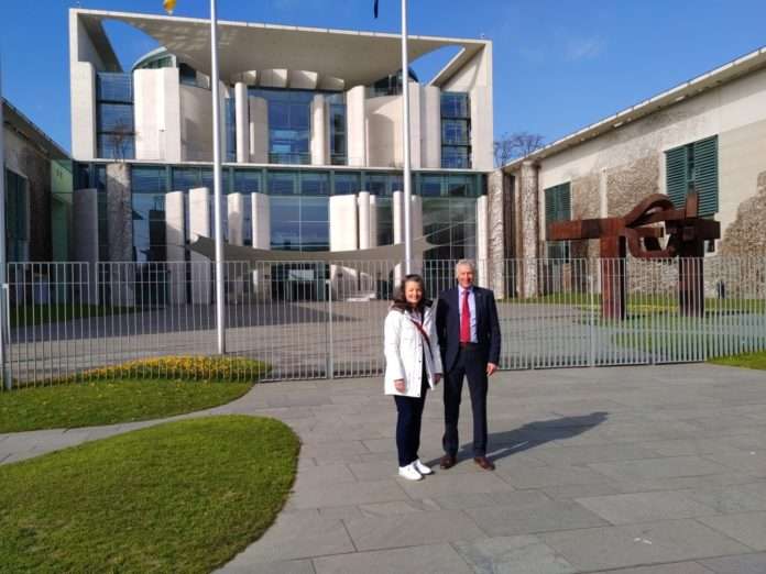 Bild: Claudia Toense, Leiterin des Referats Finanzen und Beigeordneter Peter Kiefer vor dem Haupteingang des Bundeskanzleramts in Berlin