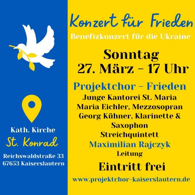 Am kommenden Wochenende versammeln sich unter der Leitung von Dekanatskantor Maximilian Rajczyk ChorsängerInnen aus verschiedenen Chören Kaiserslauterns zum Projektchor – Frieden (www.projektchor-kaiserslautern.de), um ein gemeinsames „Benefizkonzert für die Ukraine“ zu veranstalten. Der kurzfristigen Einladung sind 50 Chorsängerinnen und Chorsänger gefolgt, die mit gemeinschaftlichen Chorgesang ihren persönlichen Beitrag zum Frieden leisten wollen.