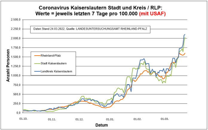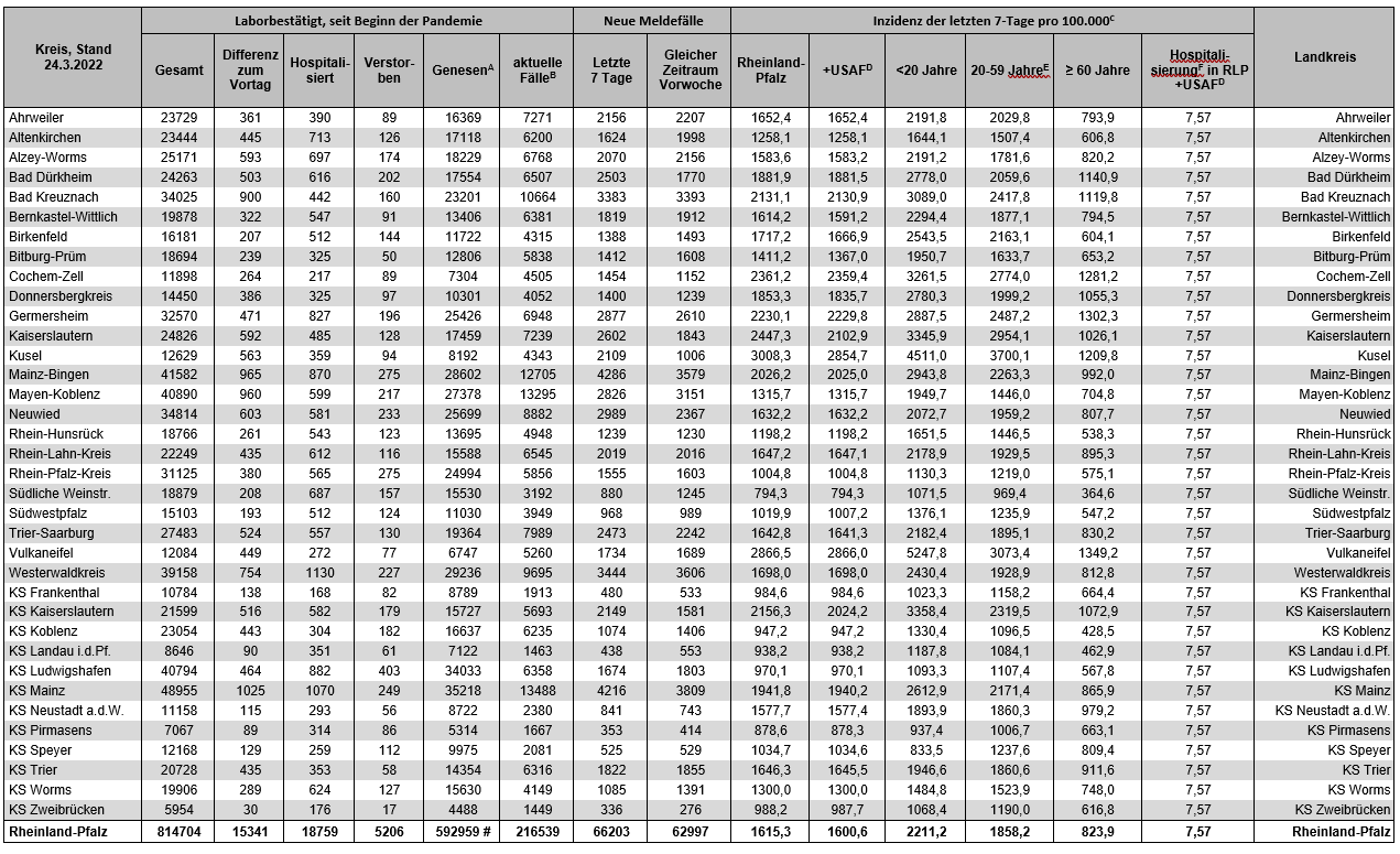 Coronavirus SARS-CoV-2: Fallzahlen für Rheinland-Pfalz, (Datenstand vom 24.03.2022, 14:10 Uhr)