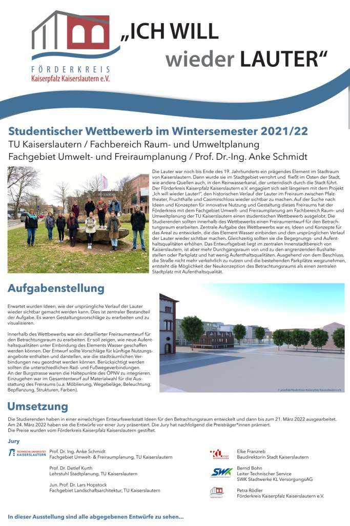 Fünf ausgearbeitete Ideen zur Gestaltung des Areals vom Casimirschloss bis zum Pfalztheater-Parkhaus sind das Ergebnis eines studentischen Wettbewerbs der TU Kaiserslautern, Fachbereich Raum- und Umweltplanung/Fachgebiet Umwelt- und Freiraumplanung, den der Förderkreis Kaiserpfalz Kaiserslautern e.V. im September 2021 ausgelobt hatte. Die Arbeiten der Studierenden wurden am 24. März 2022 vor einer Jury von den Studierenden präsentiert. Diese hat die Preisträger ermittelt und ausgezeichnet. Die Arbeiten sind ab sofort im Foyer des Rathauses zu sehen.
