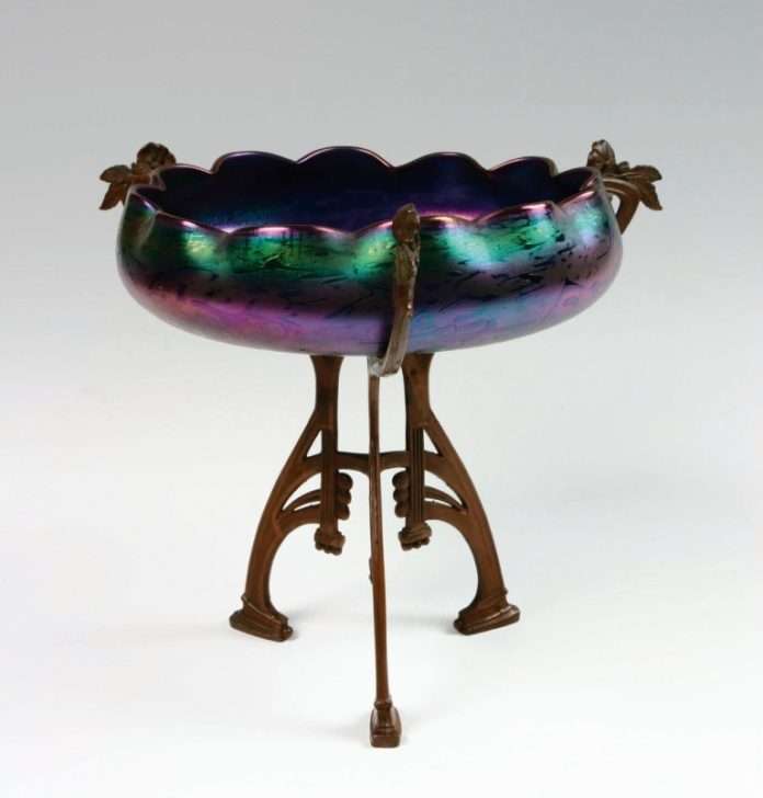 Herausragendes Jugendstilbeispiel: Schale mit Kupfermontierung, um 1900, aus der Manufaktur Johann Loetz Witwe
