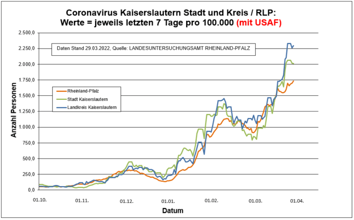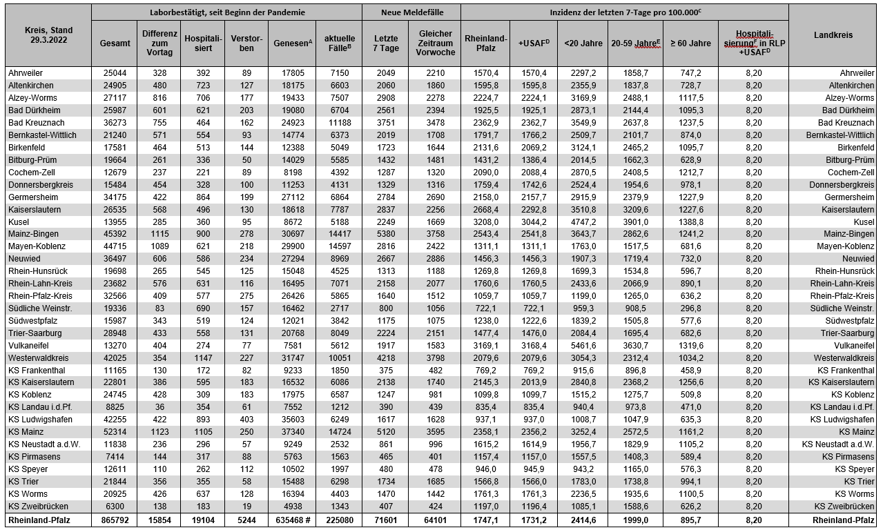 Coronavirus SARS-CoV-2: Fallzahlen für Rheinland-Pfalz, (Datenstand vom 29.03.2022, 14:10 Uhr)