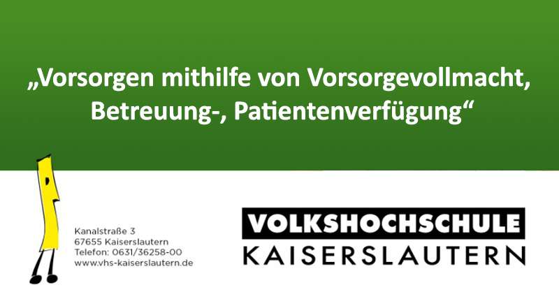 Am Donnerstag, dem 21.04.2022, findet in der Volkshochschule Kaiserslautern um 15 Uhr, ein Vortrag zum Thema; „Vorsorgen mithilfe von Vorsorgevollmacht, Betreuung-, Patientenverfügung“ statt. Tritt der Fall ein, dass Sie durch einen plötzlichen Unfall, eine Krankheit oder auf anderem Wege Ihr Bewusstsein verlieren, so muss eine andere Person anstehende Entscheidungen für Sie treffen. Entgegen der landläufigen Meinung dürfen der Ehegatte, die Kinder oder andere nahestehende Angehörige nicht automatisch Entscheidungen für Sie vornehmen. Sorgen Sie jetzt vor, und bestimmen Sie, wer in solchen Fällen wie für Sie entscheidet. In dieser Veranstaltung werden Ihnen verschiedene Möglichkeiten der Vorsorge und die Abgrenzung zur gesetzlichen Betreuung dargestellt. Geleitet wird der Vortrag von Christian Simunic.