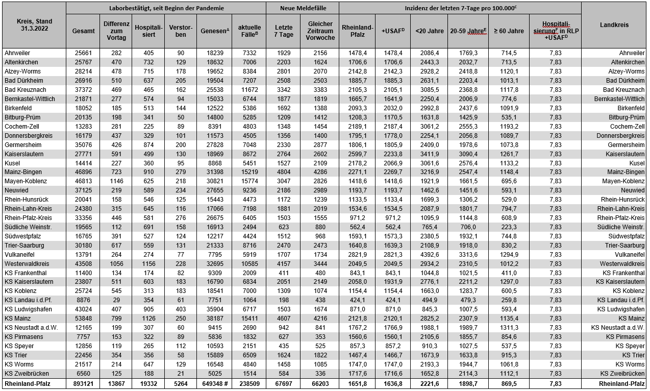 Coronavirus SARS-CoV-2: Fallzahlen für Rheinland-Pfalz, (Datenstand vom 31.03.2022, 14:10 Uhr)