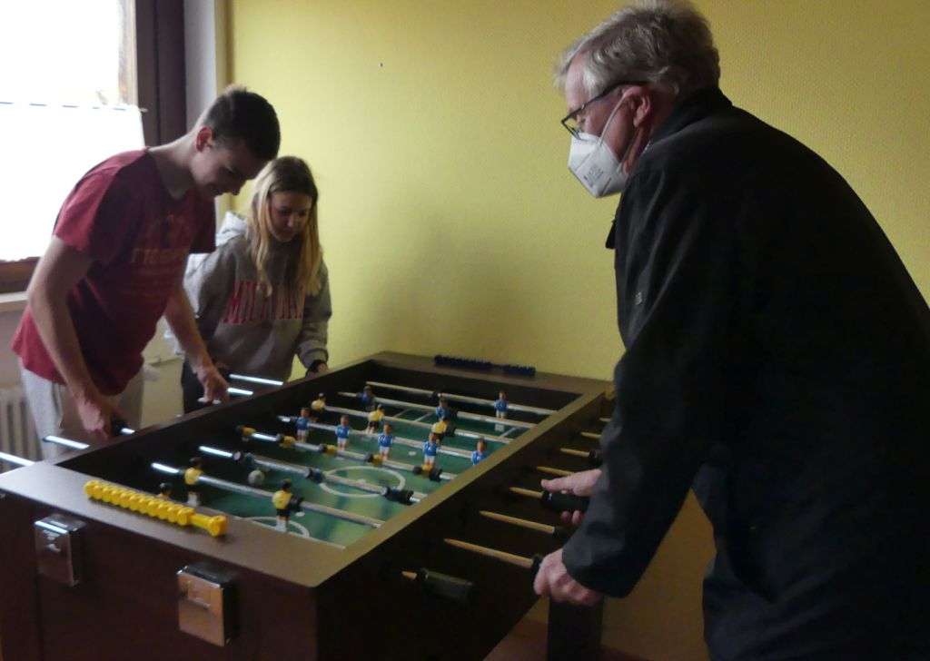 Tischfußball mit dem Bezirkstagsvorsitzenden Theo Wieder (rechts): hörgeschädigte Jugendliche der PIH-Partnerschule in Kiew