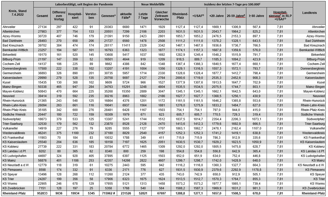 Coronavirus SARS-CoV-2: Fallzahlen für Rheinland-Pfalz, (Datenstand vom 07.04.2022, 14:10 Uhr)
