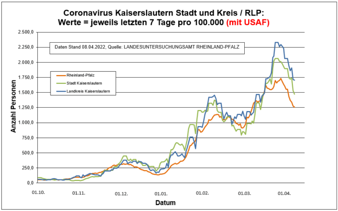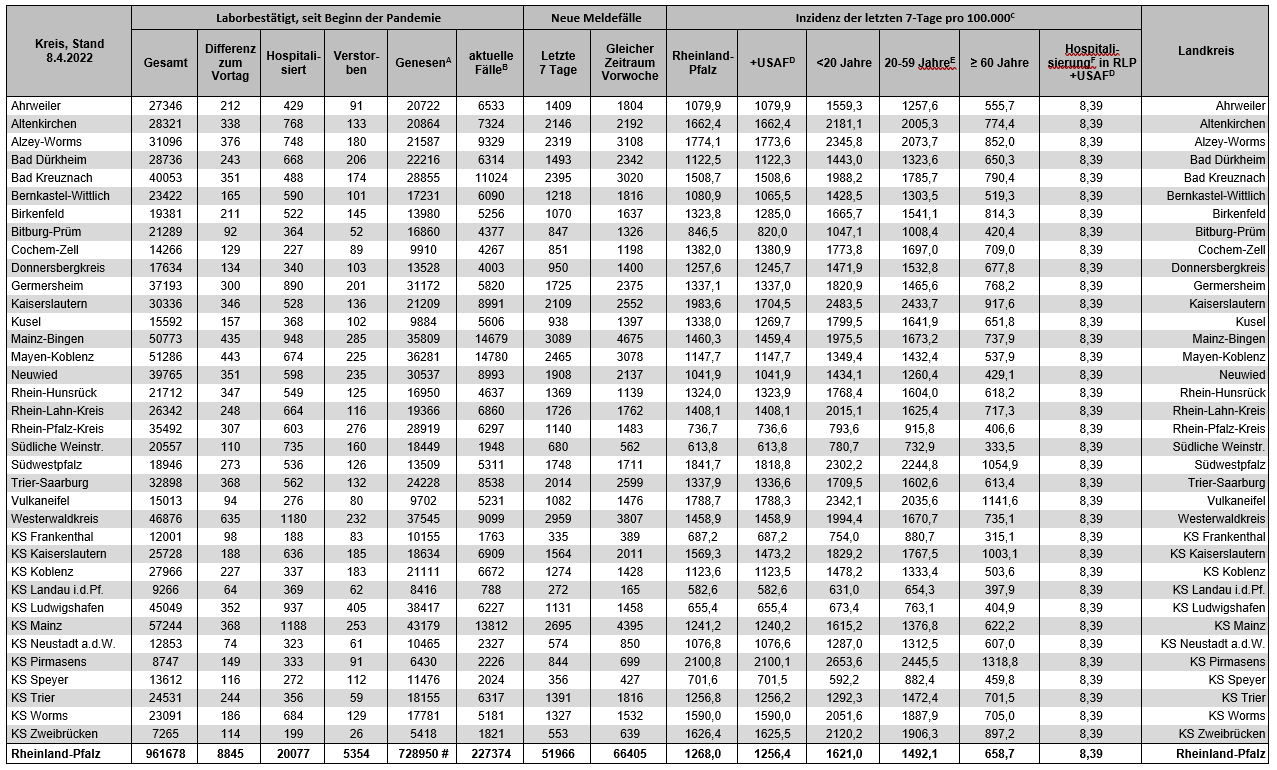 Coronavirus SARS-CoV-2: Fallzahlen für Rheinland-Pfalz, (Datenstand vom 08.04.2022, 14:10 Uhr)