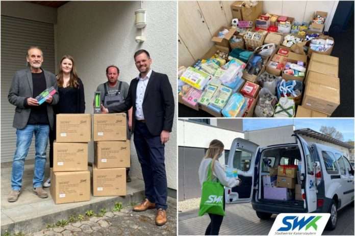 Die Stadtwerke haben kurzfristig eine Spendenaktion für ihre Mitarbeitenden auf die Beine gestellt. Schnell und unbürokratisch vor Ort Hilfe leisten, das war das Ziel. Mit dem ASZ Kaiserslautern, das rund 120 Kriegsflüchtlingen Zuflucht und Unterkunft bietet, war schnell ein geeigneter Partner gefunden. Susanne Runge, ASZ Kaiserslautern, erklärt: „Die Menschen, die aus dem Kriegsgebiet fliehen mussten, haben häufig nicht mehr als die Kleidung, die sie tragen. Mit wenigen Habseligkeiten im Gepäck, kommen sie bei uns an. Für ein Dach über dem Kopf haben wir gesorgt und verschiedene Häuser zu Unterkünften hergerichtet. Es fehlt aber dennoch an den nötigsten Alltagsgegenständen wie z. B. Handtücher, Decken, Pflegeprodukte, Seife, Windeln, Babynahrung, Wasserkocher, Tassen usw. Dass die Belegschaft der SWK hier schnell eingesprungen ist, entlastet uns sehr. Dafür bedanken wir uns herzlich.“