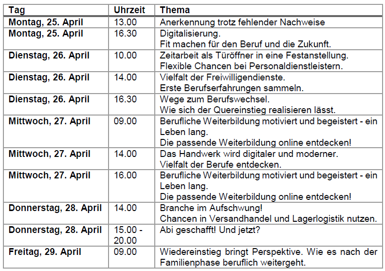 Ausführliche Informationen zu den jeweiligen Vorträgen gibt’s online unter https://www.arbeitsagentur.de/vor-ort/kaiserslautern-pirmasens/bpw. Dort sind auch die Zugangslinks zu finden.