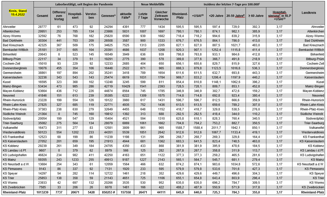 Die Fallzahlen zum Coronavirus in Rheinland-Pfalz: Seit der letzten Meldung am Samstag, 16. April, gibt es 8.970 neue bestätigte Corona-Fälle, 9 weitere Personen sind im Zusammenhang mit einer Infektion gestorben. Die landesweite 7-Tages-Inzidenz beträgt 645,9 pro 100.000 Einwohner. Die landesweite 7-Tages-Hospitalisierungsinzidenz beträgt 3,17 pro 100.000 Einwohner. Sie erhalten heute die Übersichten für den 17., 18. und 19. April 2022.